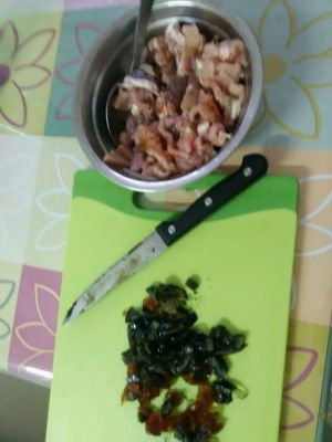 皮蛋切碎,瘦肉提前用油放冰箱一晚,拿出来放盐少许,生抽腌制20分钟