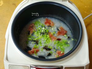 三十分钟后,粥已粘稠,倒入剩下的皮蛋和切碎的菠菜,加盐和鸡精调味,撒入适量葱花;