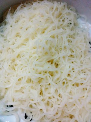 将龙口粉丝冷水冲净备用(勿长时间浸泡)。
