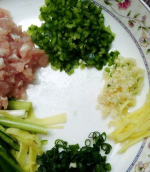 把葱花,蒜粒,姜丝切好待用,还可以切几段葱白备用