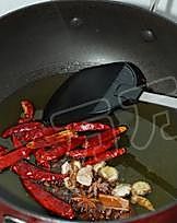 将蒜,姜,葱,花椒,干辣椒炝锅,加入郫县豆瓣