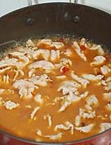锅中放少许食用油,加花椒,葱姜蒜爆香后放入郫县豆瓣酱,炒制后加少许生抽和水,然后放入滑好的肉片,煮开几分钟。