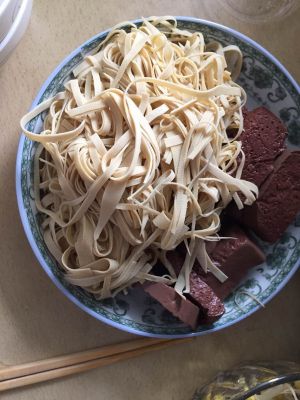 加水,加鸡精调味,烧开后熬制几分钟,然后下配菜,烫熟,捞起铺在碗底。