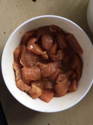 先把肉肉腌一下,料酒啊生抽啊鸡精,盐,淀粉,黑胡椒粉