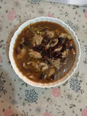 锅内烧热油下郫县豆瓣酱蒜片葱末爆香烹料酒生抽,加汤适量加少许老抽调色!