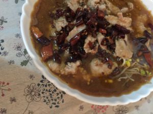 把汤全部倒入。放砸碎的辣椒、花椒、蒜末、芝麻。然后烧热油浇到上面。