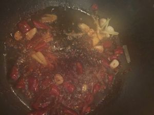 用剩下的辣椒和花椒,凉锅冷油。翩出香味,出锅。