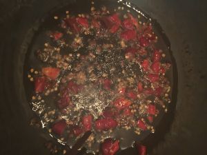 热油,葱花姜炝锅。适量豆瓣酱翻炒。