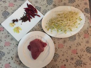 准备食材,猪肉,黄豆芽,辣椒,花椒,姜,蒜。