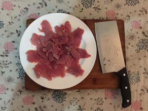 猪肉,切片。切的片大点,个人感觉这样好。要不小了,不美观。当然了我刀工不是多么好。