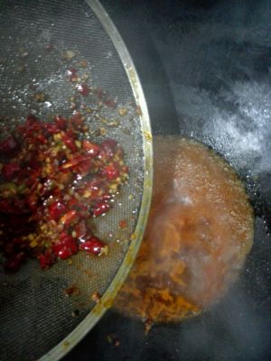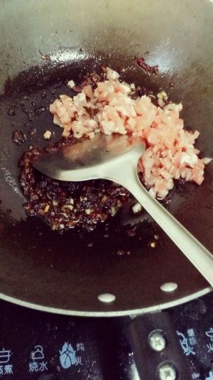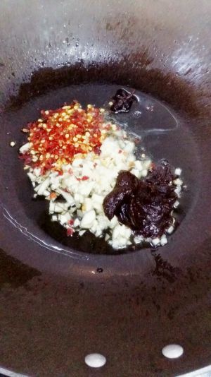 蒜末豆瓣酱辣椒末放入油锅,直到炒出香味(本人爱吃辣,如不吃辣,可以不当辣椒)