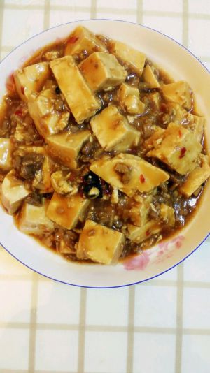 豆腐不能翻动,只能晃锅或者用木铲轻轻推动,煮5到8分钟放入水淀粉勾芡,因为我家花椒粉是现磨的,粒有点大,我直接放锅里的,放少许味精起锅