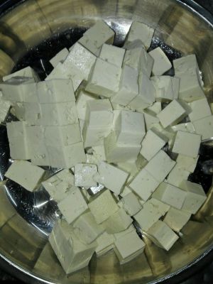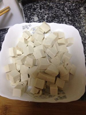 豆腐冲洗干净,用刀沾水切成小丁块,这样豆腐容易熟也容易入味