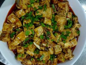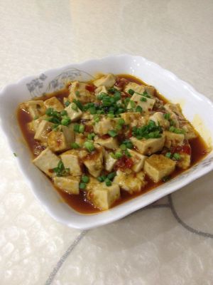 装盘撒上葱花,搞定,一块豆腐刚好够两个人吃
