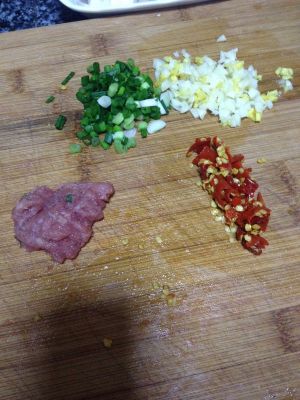 把姜蒜,泡椒,小葱,肉肉都切末,肉末适量加点盐腌制一会