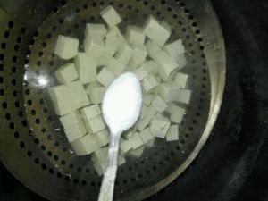 大火锅里加入适量水,放入豆腐放适量盐煮至豆腐入盐味沥干水备用,肉末炒熟乘出备用。