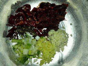豆瓣酱,干辣椒,辣椒,葱白末,姜末,蒜末放容器中备用。
