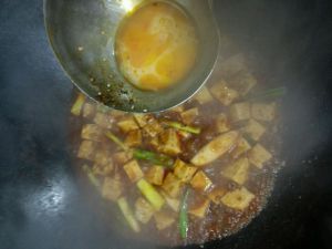 豆腐入锅,铲子翻过来,慢点从底部推,大约三分钟左右,入味。出锅前加入少许淀粉(凉白开混成水状)