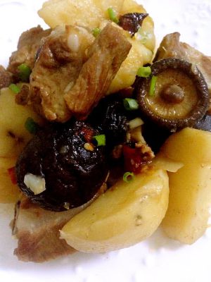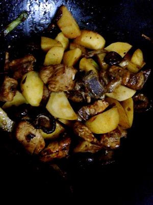 热锅热油放入大蒜 生姜 八角 花椒 干辣椒 少许豆瓣酱 爆香 再放入排骨翻炒倒入酱油上色 加入土豆 泡好的香菇放入盐 鸡精 少许味精继续翻炒