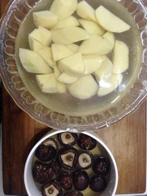 土豆切块先浸泡的水中,干香菇用热水泡好