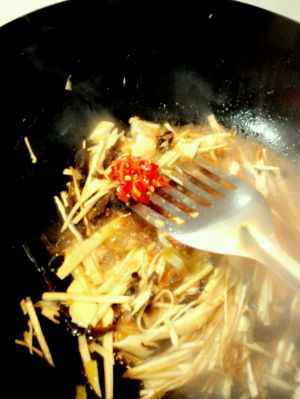 葱姜煸好放入笋丝和木耳丝煸炒一分钟,放入一碗水,继续煸炒一会。