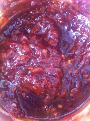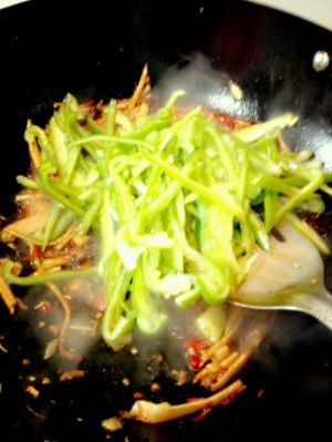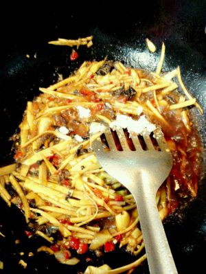 放入甜面酱,郫县辣酱和剁椒酱,继续翻炒到笋丝成熟。