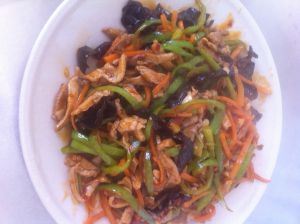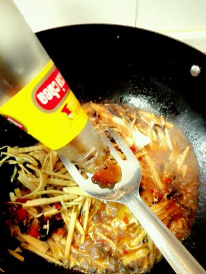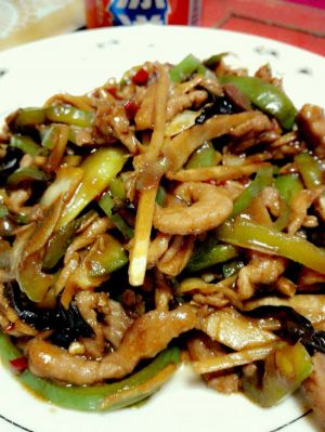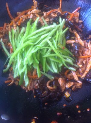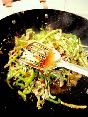 依次再下肉丝和尖椒丝,翻炒几下,放入调味料,事先最好把酱油醋和糖按照需要的量调陈碗汁,这样比较方便