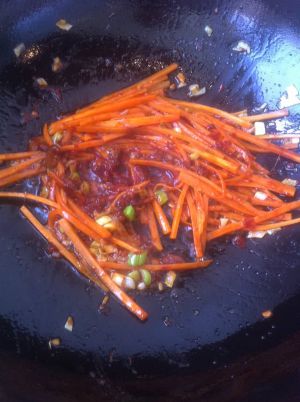 放入胡萝卜丝,翻炒均匀后放入豆瓣酱,注意小火,不要将豆瓣酱炒糊,