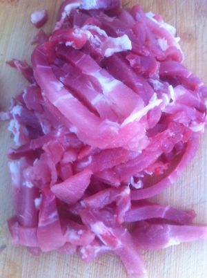 猪肉切成丝,然后装盘撒上淀粉,料酒,咸盐,橄榄油!