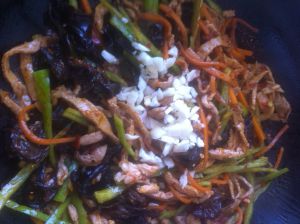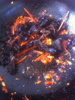 葱丝翻炒均匀把木耳和胡萝卜丝倒进去,翻炒半分钟。
