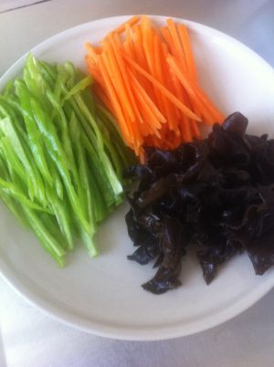 泡发的木耳切丝,胡萝卜切丝,青椒切丝