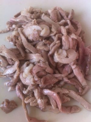 切成条,加入料酒一勺,盐少许,花椒粉少许,淀粉一勺抓匀腌制