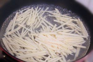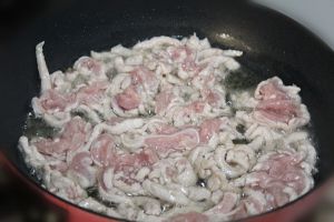 锅中加入适量的油,油热后,将肉丝放入锅中。煸炒至肉丝发白即可盛出备用。