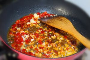 锅中留适量的底油,油热后,加入少许豆瓣酱、剁椒、蒜末炒出香味。
