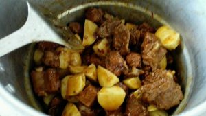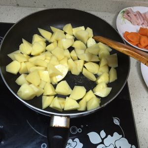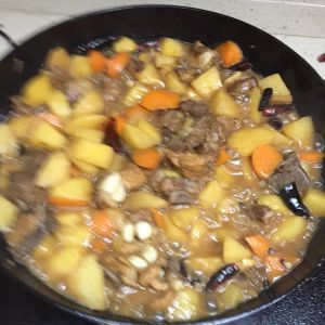 炒好后加水大火烧开改小火煮 加入土豆胡萝卜继续煮 煮到土豆绵软 加盐大火收汁