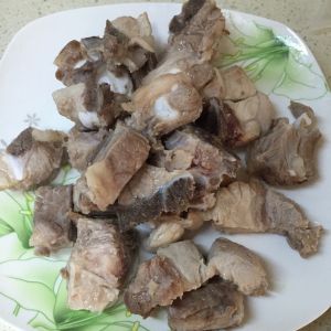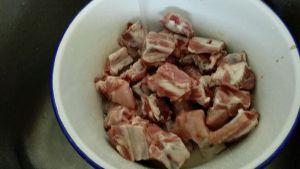 排骨剁小块,开水清洗,一次去血,二次洗净,三次烫白!