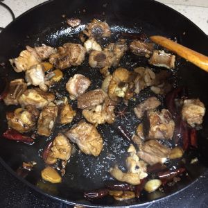 倒油烧热 加蒜姜干辣椒八角花椒炒香 再加入冰糖酱油醋炒 然后倒入排骨继续翻炒