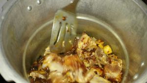 放入排骨,放入生抽老抽适量,不用放盐了,这样炒一分钟,加少许水,埋住排骨即可。高压锅压8分钟。