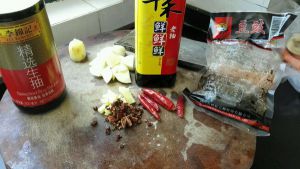 独蒜头切滚刀,姜拍烂,花椒,八角,干辣椒及豆豉、生抽老抽备好~