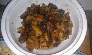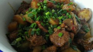 随后加入小土豆,翻炒均匀后加入没过食材的水。(加入热水最好不过了)放入葱节盖上盖子大火烧个5分钟,关中火慢炖。炖至土豆变软这个时候就可以开始大火收汁了。汁水收得和图片差不多就可以 放鸡精,少许藤椒油,少许生抽进行调味了!