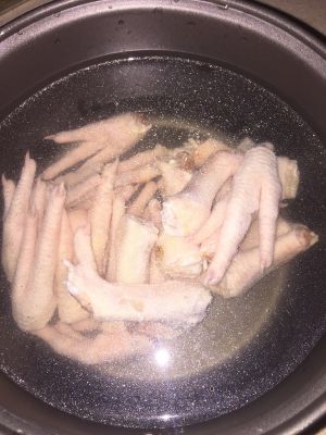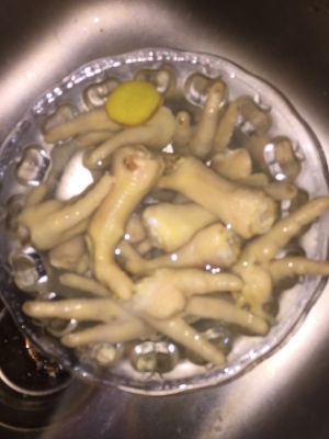 鸡爪切指甲,分两半,加水,八角两个,姜,白酒一瓶盖煮软,筷子能轻松扎透即可,然后捞出来凉开水泡冷 这是随便找的图,大家按说明做即可