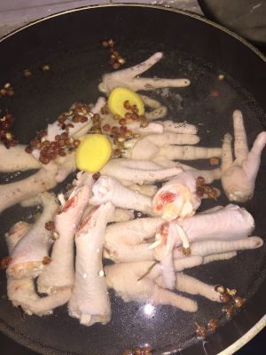 锅内注入清水,放入辣椒干,大料等,放入鸡爪,烧大概10分钟左右