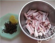 鸡爪冷水放几片姜煮熟,不要煮的太软,煮熟后凉水冲一会。