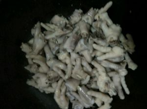 洗好鸡爪,剪掉指甲,下锅煮,加入生姜老酒去腥
