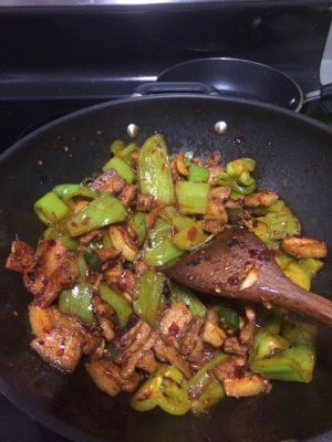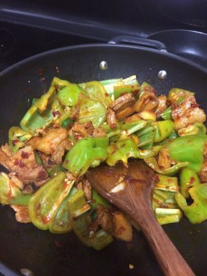 炒至青椒软了,放少许生抽,肉色更深,肥肉部分变跟少就可以出锅了