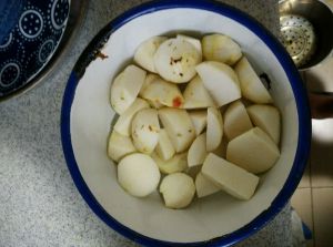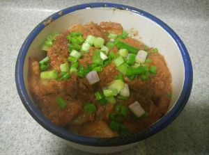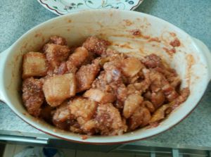 啊哈,首先就是肉的处理了,切成块之后,(关于切块呢,我是随便切的,宿舍的刀那个小啊 = =所以你喜欢怎么样就怎样切吧),用料酒(宿舍没了,我用的醋代替 = = ),盐,生抽,老抽,豆瓣酱,豆腐乳都加进去拌匀,放置和味。据说用2。3个小时,但是有大概用了一个半小时左右吧
