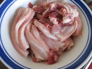 挑选肥瘦均匀的五花肉,我选择瘦肉多一点的。洗干净放冰箱里冷冻一下,这样方便切片。