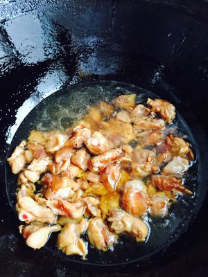 锅内倒入油,六成热时倒入鸡块,中火炸制棕红色