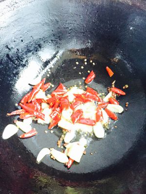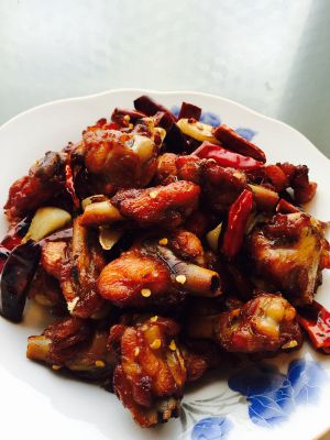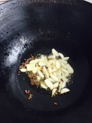 到入油(用铲子,一铲子油就好),放入辣椒、花椒,大蒜、生姜,葱段,小火翻炒至(辣椒呛鼻,花椒的香味,注意火候辣椒不要糊了)到入鸡肉,翻炒几分钟,装盘。