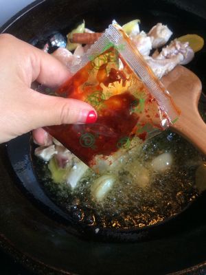 放入鸡肉,和郫县豆瓣